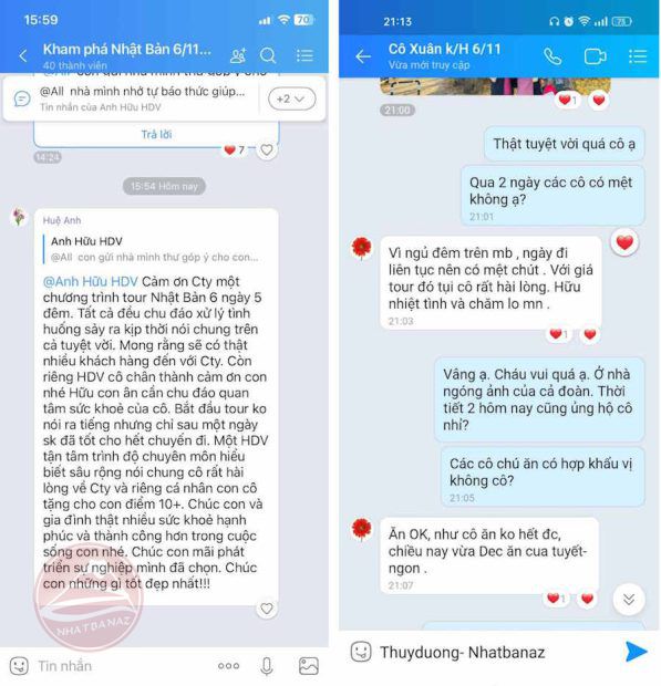 NhatbanAZ nhận được đánh giá, góp ý từ rất nhiều khách hàng từ các kênh khác nhau. Thường nhất là qua Zalo của nhóm tour. Và đó thực sự là niềm vui của những người làm dịch vụ. Mỗi lần nhận được ý kiến khách hàng là cả công ty trao đổi rộn ràng lên.