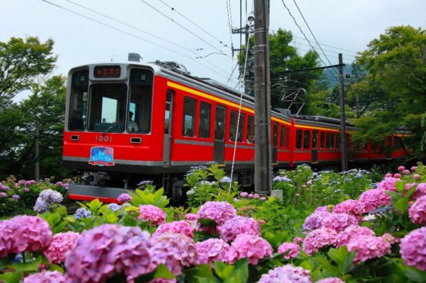 Tuyến đường sắt Hakone Tozan (箱根登山電車, Hakone Tozan Densha) trên núi lâu đời nhất của Nhật Bản. Chuyến đi 35 phút này là một trải nghiệm thú vị. Tàu lượn quanh co qua một thung lũng hẹp, giữa rừng cây, qua nhiều cây cầu cao chót vót giữa các ngọn núi và cả những đường hầm. Tuyến đường Hakone-Yumoto đến Gora đặc biệt đẹp vào mùa hè khi hàng ngàn bông cẩm tú cầu (ajisai) nở rộ dọc theo đường ray lấp lánh sắc màu dưới ánh đèn.
