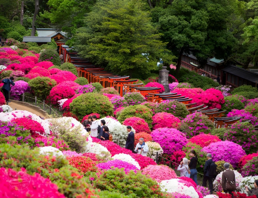 - Khám phá Đền Nezu (Nezu Jinja): ngôi đền cổ kính nằm giữa lòng Tokyo, nổi tiếng với lối đi qua hàng trăm cổng torii đỏ rực và khu vườn hoa đỗ quyên rực rỡ mỗi độ xuân về. Vào mùa lễ hội hoa đỗ quyên, toàn bộ khuôn viên đền như bừng sáng trong sắc hồng, tím và trắng, tạo nên khung cảnh cổ xưa xen lẫn nét nên thơ đặc trưng của xứ Phù Tang.