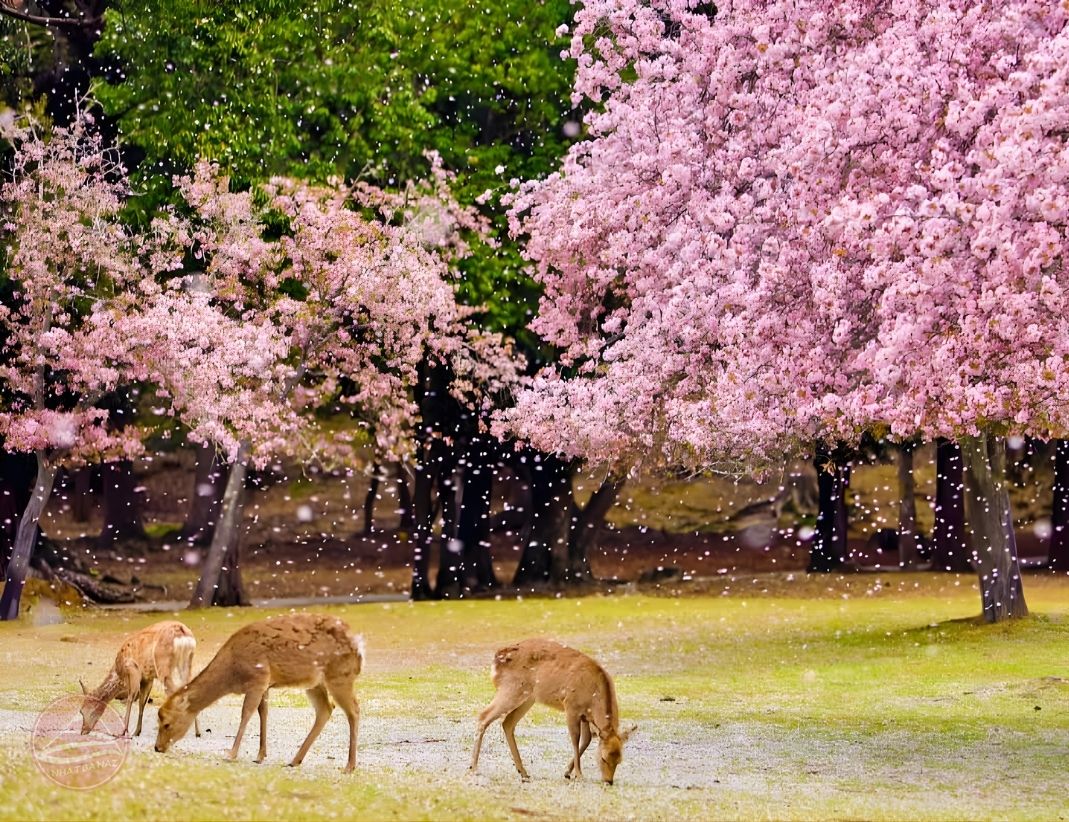 Công viên Nara: Cuối tháng 4, Nara khoác lên mình “chiếc áo xuân muộn” rực rỡ – nơi sắc anh đào kép hồng thắm vẫn còn vương trên cành, đỗ quyên bắt đầu nở rộ và những thảm cỏ vàng óng trải dài dưới nắng dịu. Giữa khung cảnh thanh bình ấy, hình ảnh đàn nai thong dong dạo bước giữa nền chùa Todaiji cổ kính tạo nên bức tranh đặc trưng của xứ Phù Tang – vừa yên bình, vừa linh thiêng. Đến với Công viên Nara, du khách không chỉ được hòa mình vào thiên nhiên mùa xuân đầy sức sống, mà còn cảm nhận được nét đẹp văn hóa lâu đời của cố đô Nhật Bản.