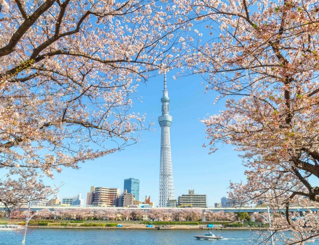- Chụp hình với tháp truyền hình Tokyo Skytree từ dòng sông Sumida.
