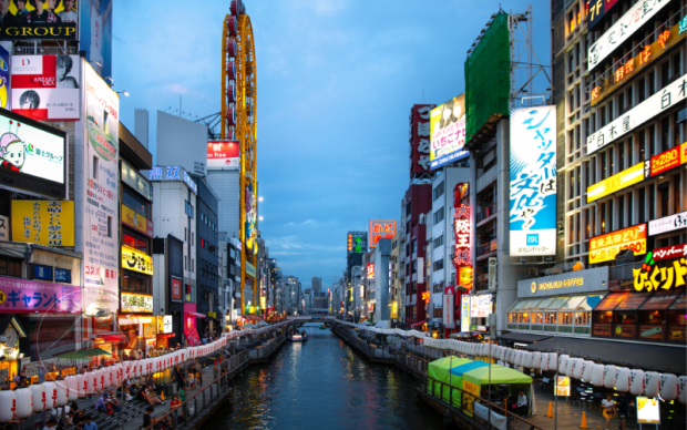 - Dotonbori: Con phố chạy song song với kênh đào Dotonbori là khu mua sắm và giải trí, ẩm thực nhộn nhịp ngày đêm. Một trong những hình ảnh đại diện Osaka trên truyền thông đó là ảnh chụp Glico Running Man và cua Kani Doraku ở khu này trong ánh đèn rực sỡ sắc màu.