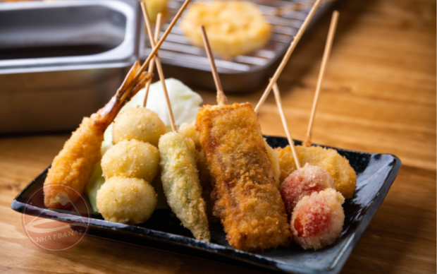 - Kushikatsu: Kushikatsu là các miếng thức ăn viên nhỏ được xiên vào que tre và rán giòn. Các loại thực phẩm như thịt, hải sản, rau củ và trứng được sử dụng trong kushikatsu. Món ăn này thường đi kèm với sốt đặc biệt và nên ăn kèm với bia.