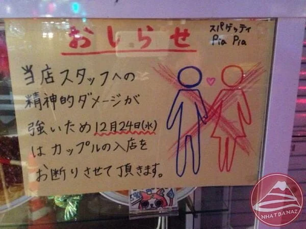 Có thể bạn chưa biết, những với người Nhật lễ Giáng Sinh (Christmas) là ngày lễ của lứa đôi, giống như ngày Valentine ở Châu Âu vậy. Nhà hàng Pia Pia đã treo tâm biển trước của của mình thông báo từ chối phục vụ các cặp đôi vì lý do “an toàn” cho nhân viên. Họ không muốn nhân viên của họ cảm thấy cô đơn, ảnh hưởng sức khỏe tâm lý khi nhìn thấy các đôi hạnh phúc bên nhau ở nhà hàng trong ngày lễ Giáng Sinh.