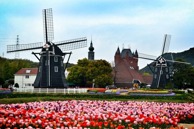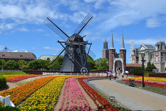 Đây là một vườn hoa với cối xay gió và ngập tràn màu sắc từ những bông hoa tulip. Quả là một phong cảnh hết sức thơ mộng và trữ tình của Huis Ten Bosch.