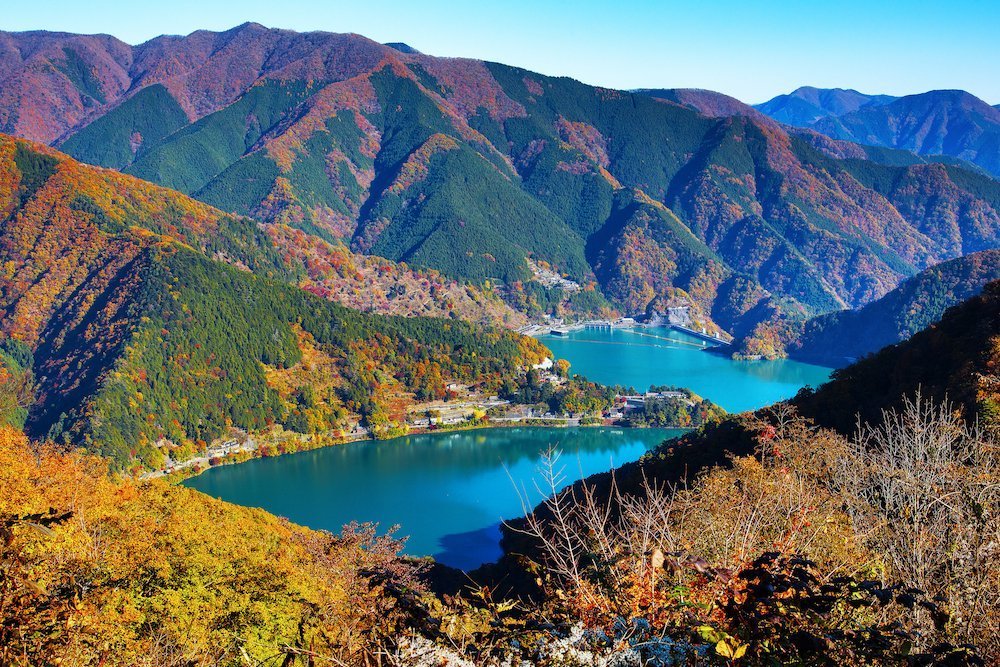 Màu sắc hồ Okutama thay đổi sắc thu khi ngắm từ xa