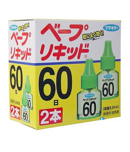 Set tinh dầu đuổi muỗi Nhật Bản Fumakilla Vape Liquid là hộp gồm 2 lọ tinh dầu đuổi muỗi thay thế, dùng để lắp vào máy đuổi muỗi tinh dầu của Nhật Vape 60 ngày. Mỗi lọ tinh dầu chống muỗi của Nhật có dung tích 45ml, dùng trong 720 giờ (tương đương khoảng 60 ngày) nên 1 hộp gồm 2 lọ sẽ dùng trong khoảng 120 ngày là 4 tháng.
